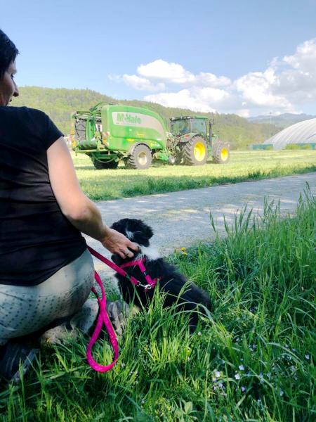 Kymba macht Bekanntschaft mit Traktor und Ballenpresse.