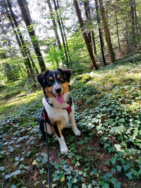Kymba's Frauchen ist Waldspielgruppen-Leiterin, daher darf Kymba oft mit im Wald dabei sein. Was gibts schöneres?