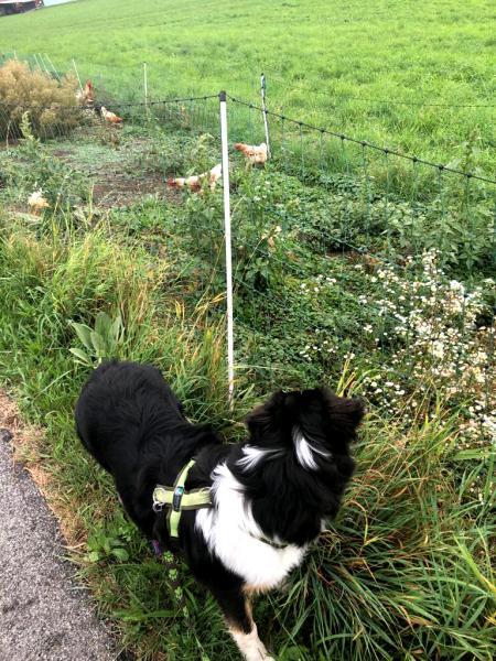 Kymba findet die Hühner toll, jedoch würde sie ihnen nie hinterher, denn sie ist ein braver Hund.
